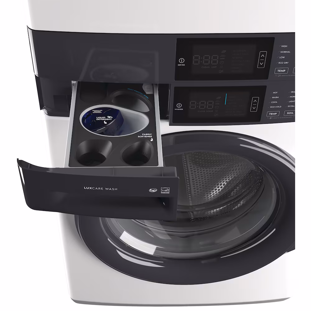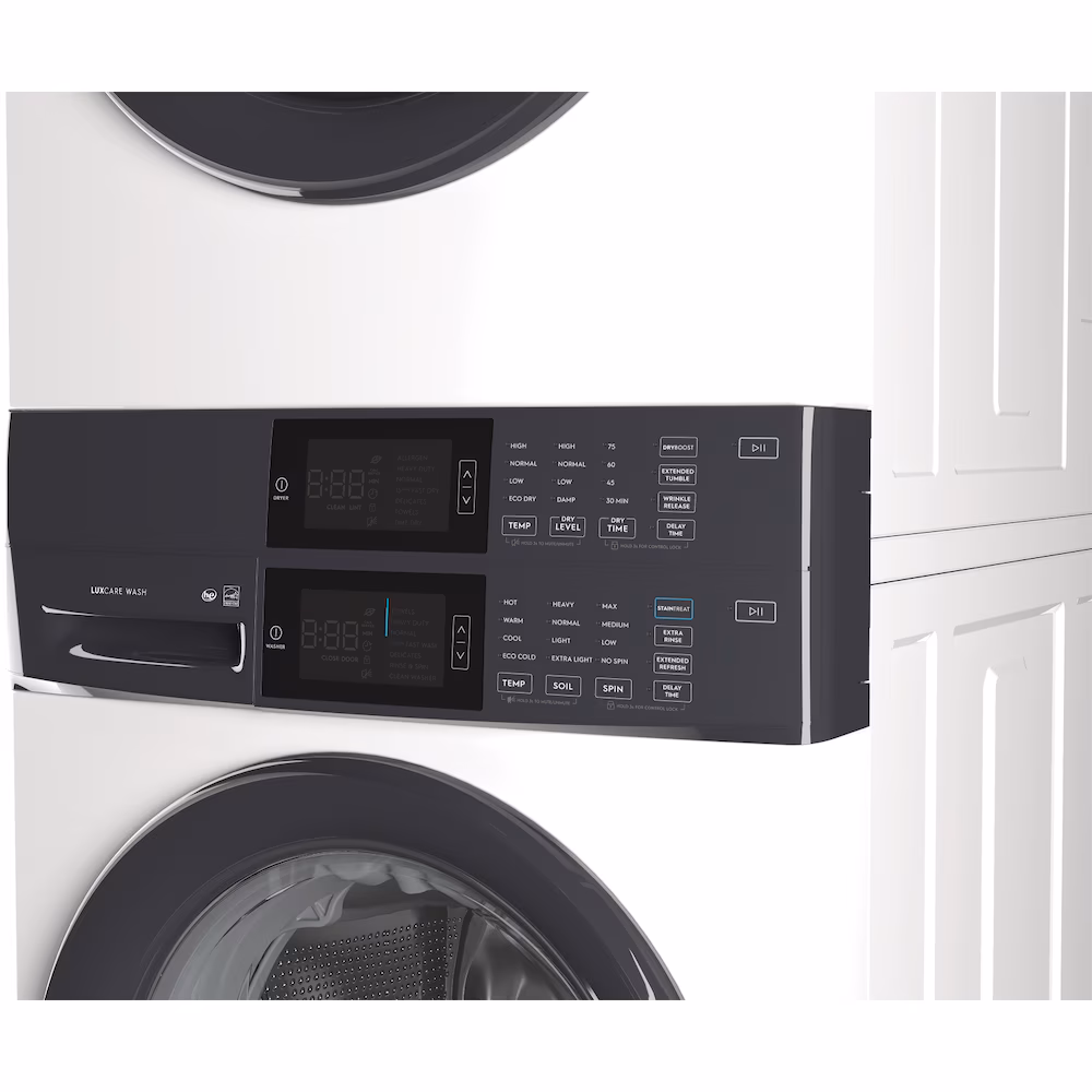 Fully integrated vertical layout takes up half the floor space of a traditional washer/dryer for greater laundry room flexibility. Features a full-sized washer on bottom, a full-sized dryer on the top, and a control panel in the middle for easy access.