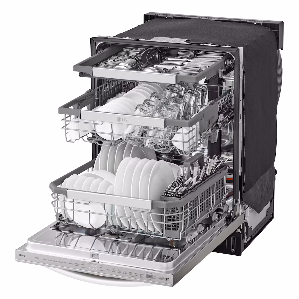 Post-dinner party cleanup. Let your LG dishwasher do the heavy lifting. LG QuadWash provides maximum cleaning coverage making it easier than ever to get your dishes clean and with TrueSteam technology you get up to 60% less water spots. The Glide Rail keeps the upper rack on track while the Ball-bearing wheel provides a smooth lower rack glide for easier loading and unloading. Need more room. No problem. The EasyRack Plus system and height-adjustable 3rd rack provide the flexibility you need to fit more dishes.