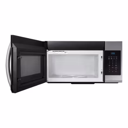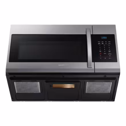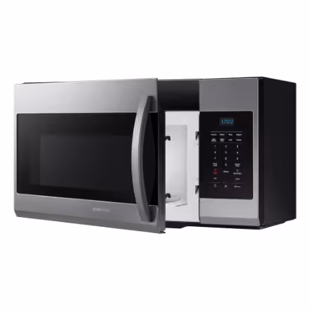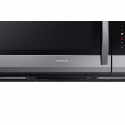 he sleek yet spacious Samsung over-the-range microwave looks beautiful in any kitchen. Its large display is brightly lit with a clean, ice-blue color for elegance and easy reading. This stainless steel microwave features intuitive controls and a variety of auto cook presets that save you time while preparing meals. It even features an Eco Mode that reduces energy consumption so you can save money, too.