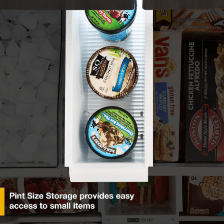 Pint Size Storage provides easy access to frozen snacks and pint-sized ice cream, so they won’t get buried in your freezer.