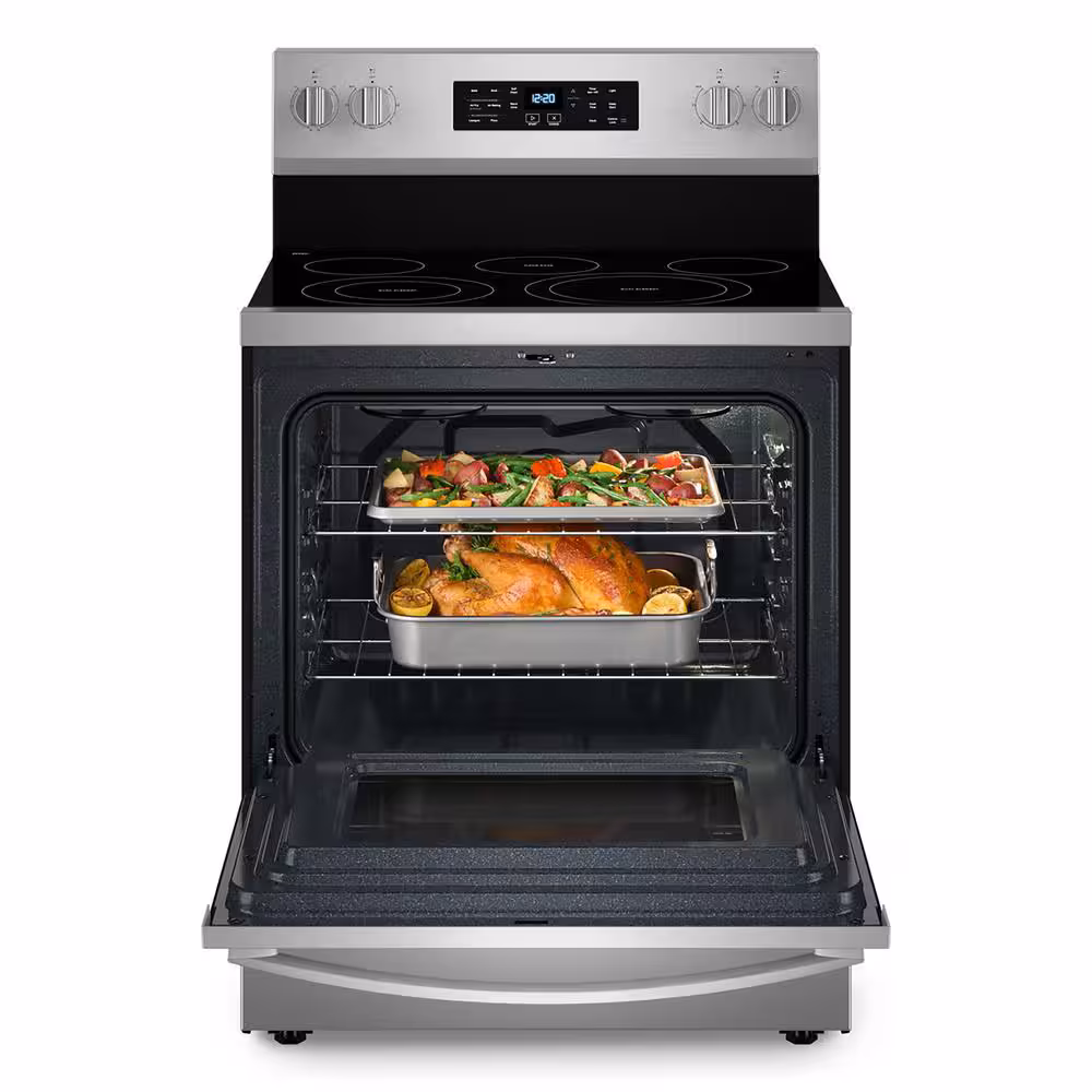 Oven Features: Dual Zone Cooking, Broiler in Oven, Air Fry, Gliding/Roll Out Racks, LED Display, Hidden Bake Element, Temperature Control, Fingerprint Resistant